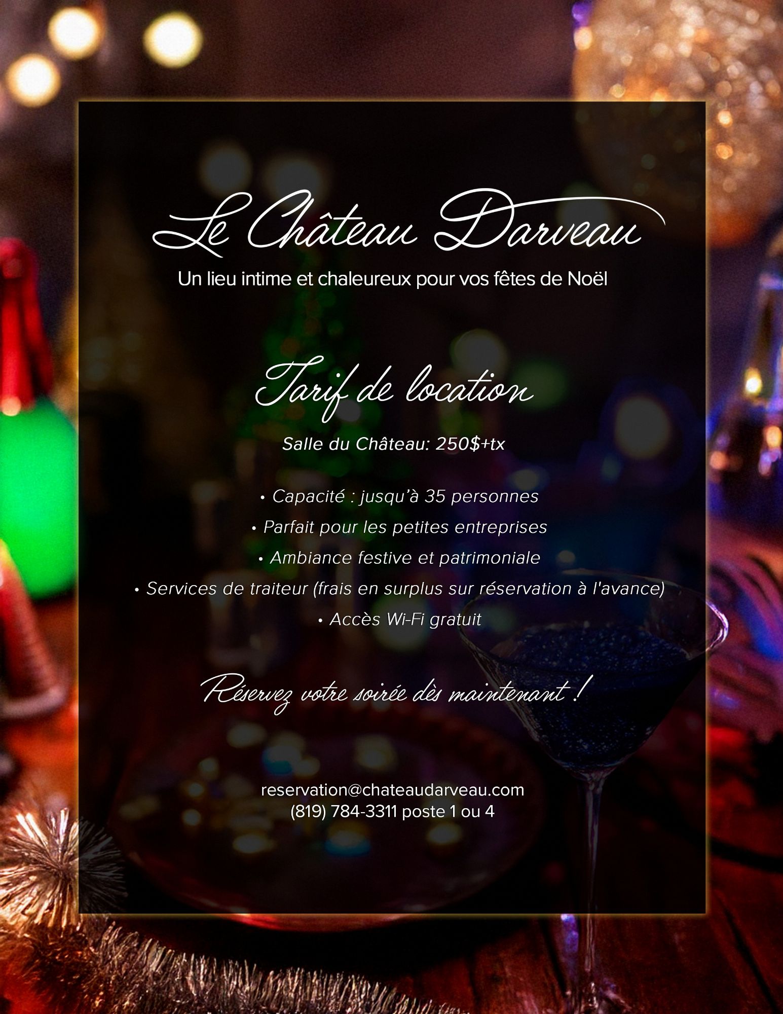 Fête de famille, souper de Noël entre collègue, pourquoi ne pas profiter du charme enchanteur du Château Darveau! Forfait disponible