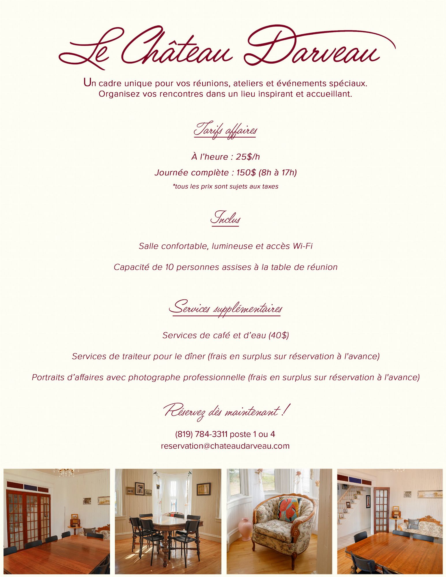 Il est désormais possible de réserver le Château Darveau pour des séances photo professionnelles. Que ce soit pour des portraits, des photos de famille, des projets artistiques ou du contenu promotionnel, le décor unique du Château offre un cadre exceptionnel. Chantal Mathieu Photographe