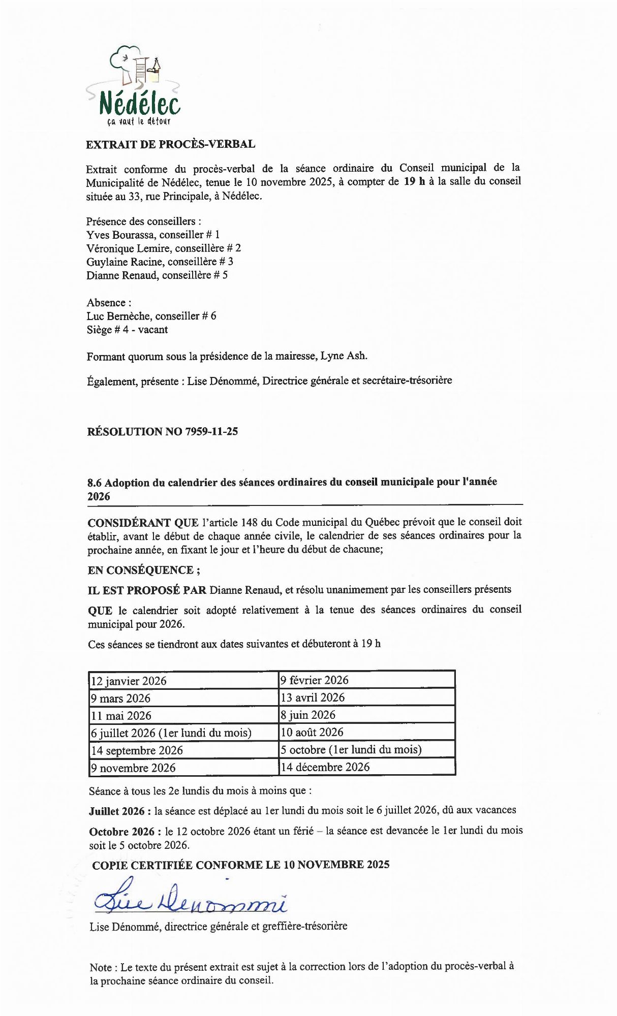 Horaire des séances ordinaires pour l'année 2026